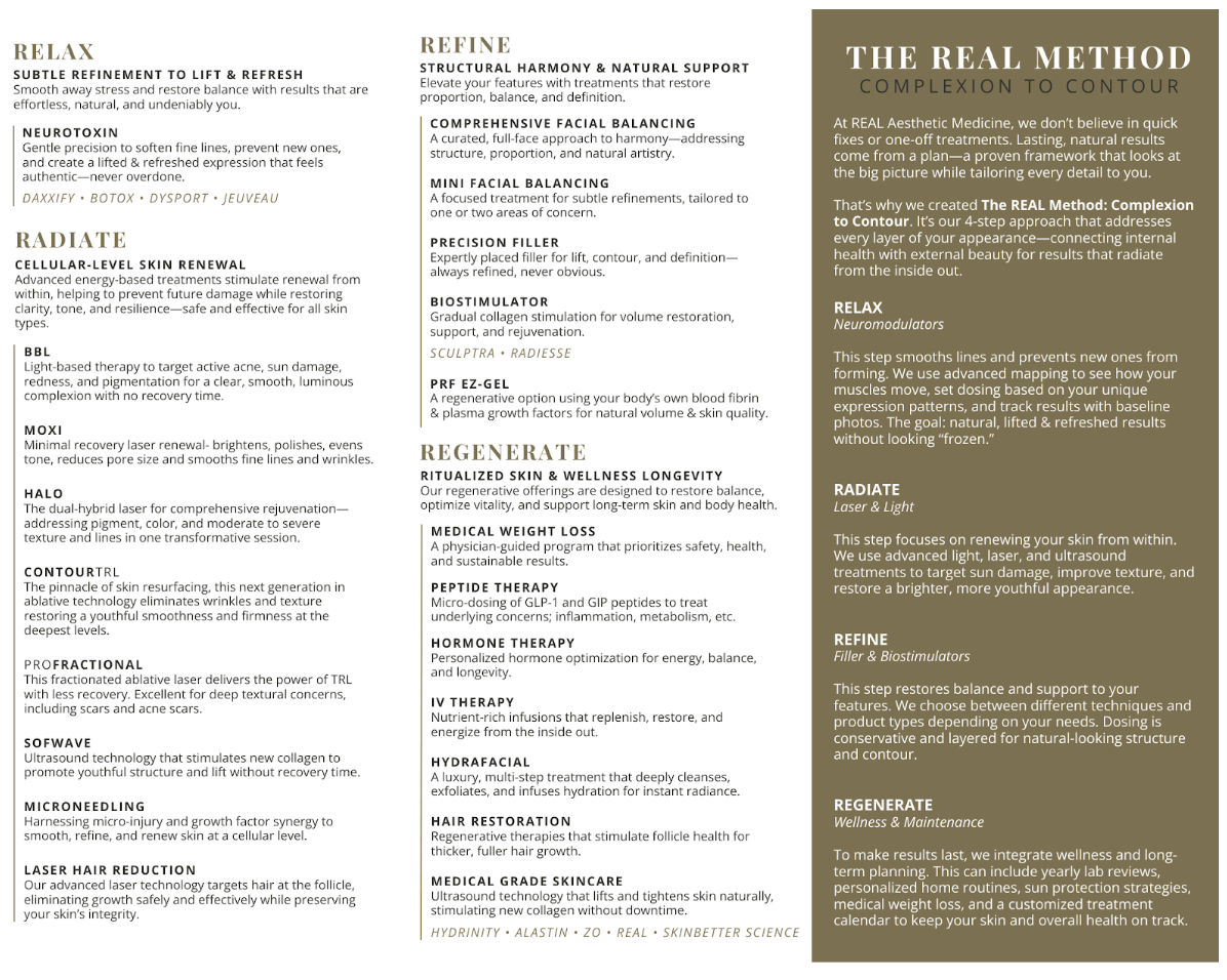 The REAL Method: Complexion to Contour at REAL Aesthetic Medicine isn’t just about looking better, it’s about aging with confidence and balance. Whether you’re beginning with Botox for fine lines, exploring laser skin rejuvenation, or seeking a holistic approach that includes medical weight loss, hormone therapy, NAD+ drips, and IV wellness infusions, our method offers a structured path to results that feel authentically you, inside and out.